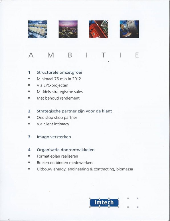 Na mijn start in 2008 als directeur van Imtech Vonk heb ik, samen met het MT, een uitdagende strategie opgesteld voor de periode 2008-2011. De hoofdpunten uit deze strategie zijn op een A5 flyer samengevat en uitgedeeld aan alle medewerkers. Deze "Ambitie" is leidend geweest in de daarop volgende jaren van Imtech Vonk. Al in 2011 hebben we kunnen constateren dat bijna alle doelen waren bereikt, waaronder de groei in personeel, omzet en rendement.